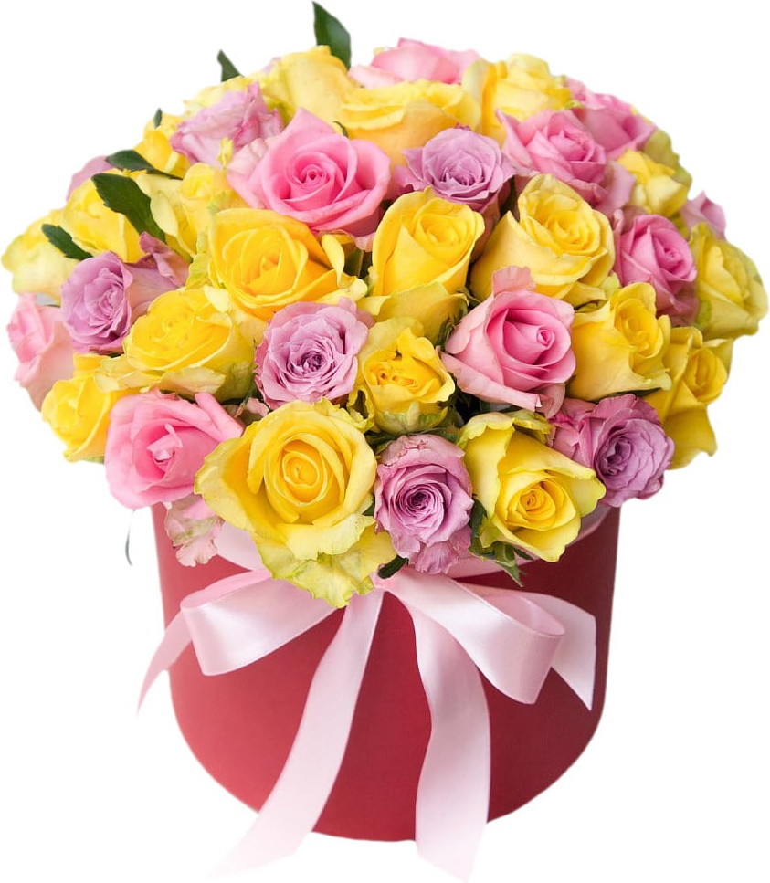 21 желтая роза, 7 сиреневых роз, 9 розовых роз, зелень, оазис, коробка, лента27 желтая роза, 10 сиреневых роз, 12 розовых роз, зелень, оазис, коробка, лента